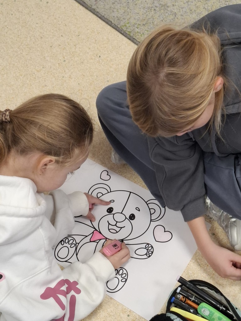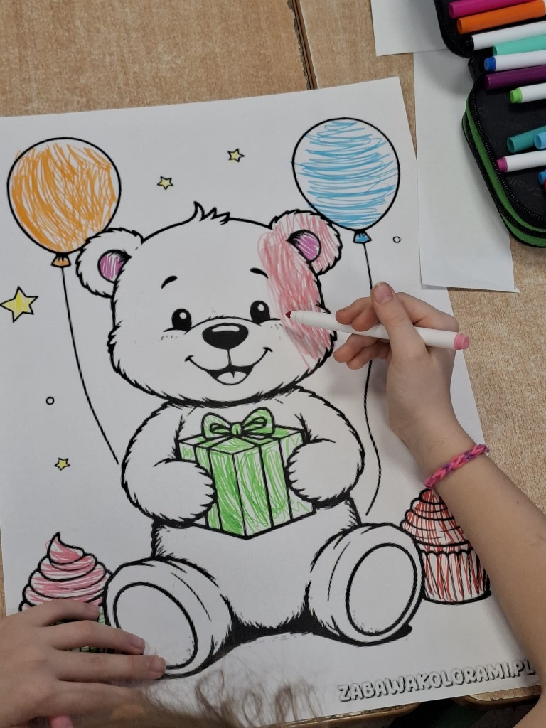 Następnie wszyscy wspólnie kolorowali misiowe kolorowanki, tworząc barwne i wesołe prace. Niektórzy uczniowie spróbowali również swoich sił w bardziej nietypowej technice – rysowali misie na specjalnym papierze, a później obserwowali, jak ich prace „rosną” po polaniu wodą.
