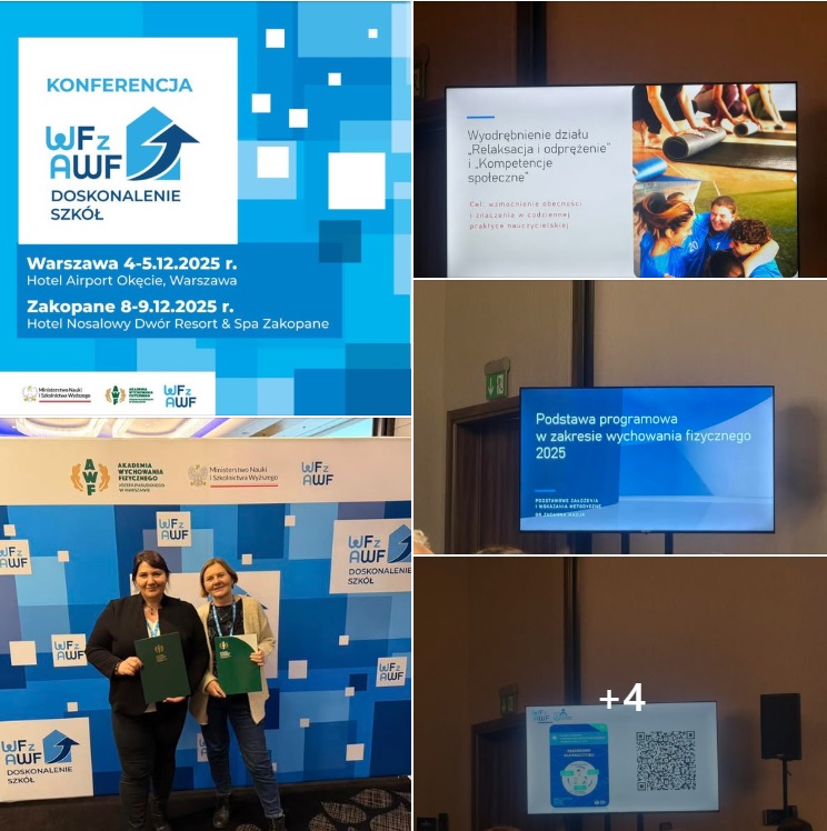W czwartek i piątek Pani dyrektor i Pani Urszula Łuszcz miały przyjemność odebrać w Warszawie certyfikat podczas konferencji WF na AWF. W ramach projektu zostało poruszonych wiele cennych aspektów szeroko pojętego ruchu dla rozwoju kompetencji uczniów. Sieć innowacyjnych rozwiązań w zakresie aktywności fizycznej i zabawy jest niezwykle ważna i jest alternatywą dla nudy i zachowań niepożądanych. Dziękujemy Panu dyrektorowi Pawłowi Drobnikowi za zaproszenie do projektu. Dziękujemy naszemu szkolnemu zespołowi koordynującemu projekt: dyrektor szkoły - Krystyna Baryś, pedagog szkolny - Urszula Łuszcz, nauczyciel wychowania fizycznego - Dominik Dobrowolski.