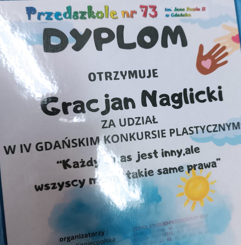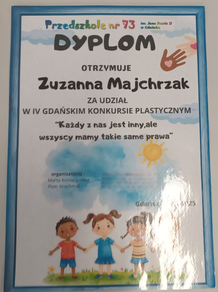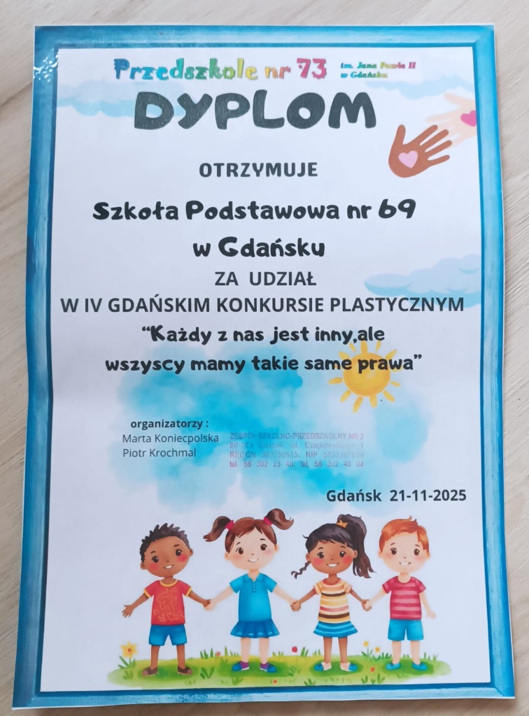 Wczoraj uczniowie naszej szkoły z klas 0A i 0B otrzymali dyplomy uczestnictwa w czwartym konkursie plastycznym pt. „Każdy z nas jest inny, ale wszyscy mamy takie same prawa”.