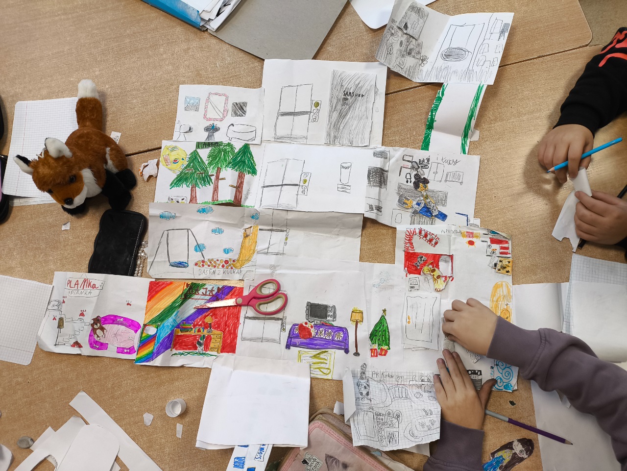 To jednak nie wszystko — uczniowie zbudowali także papierowy samochód, który idealnie dopełnia całą ich twórczą wizję.