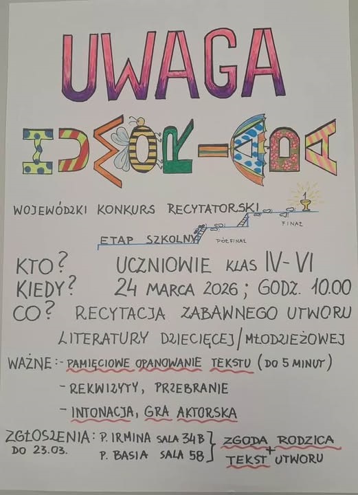 Zapraszamy uczniów klas IV–VI do udziału w szkolnym etapie Wojewódzkiego Konkursu Recytatorskiego.